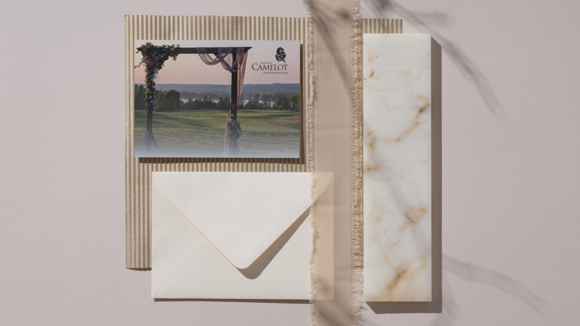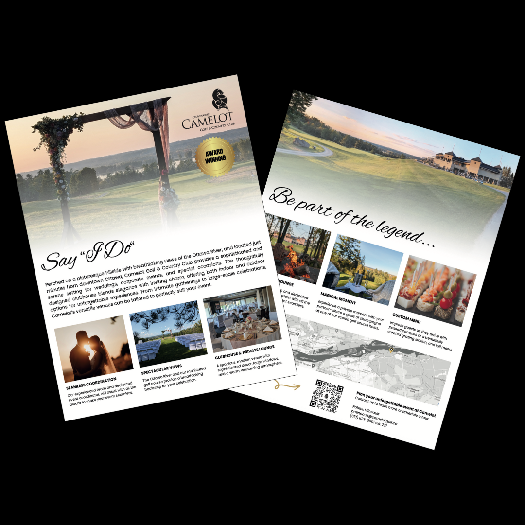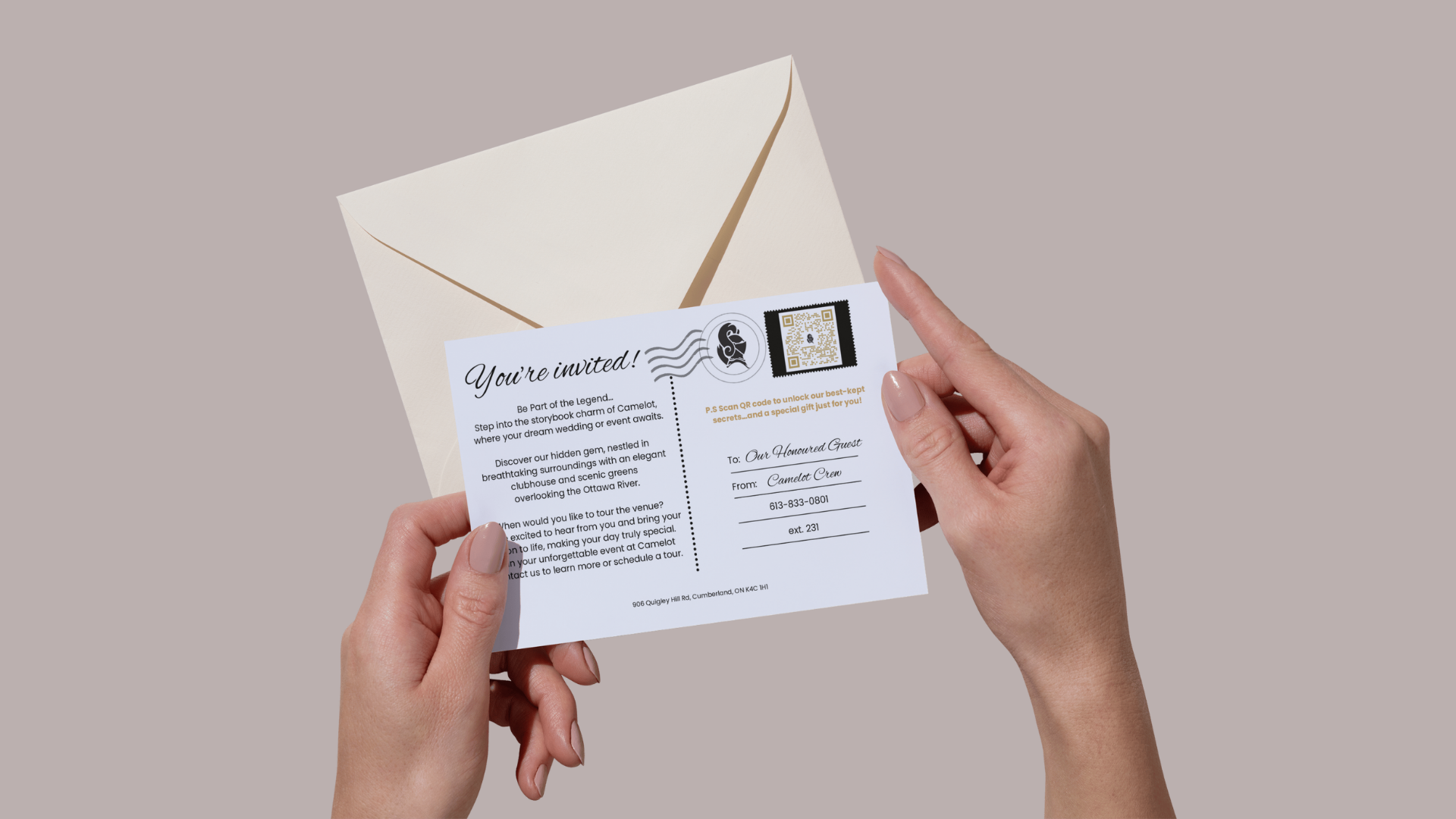 Camelot Golf & Country Club WeddingsPackaging / Marketing Collateral Wedding Show Postcards Promo Material Tradeshow attendees are invited to host their events at Camelot with special offers. QR code scan to view the wedding website and further details. VIEW WEDDING WEBSITE